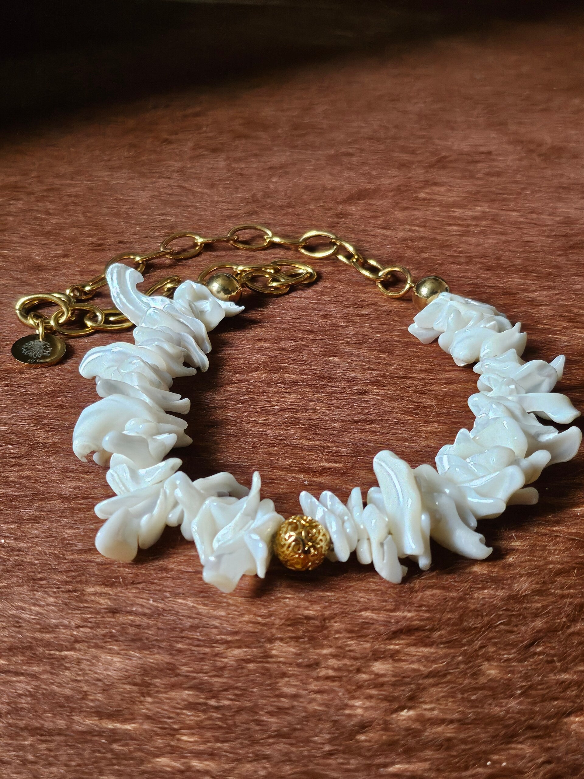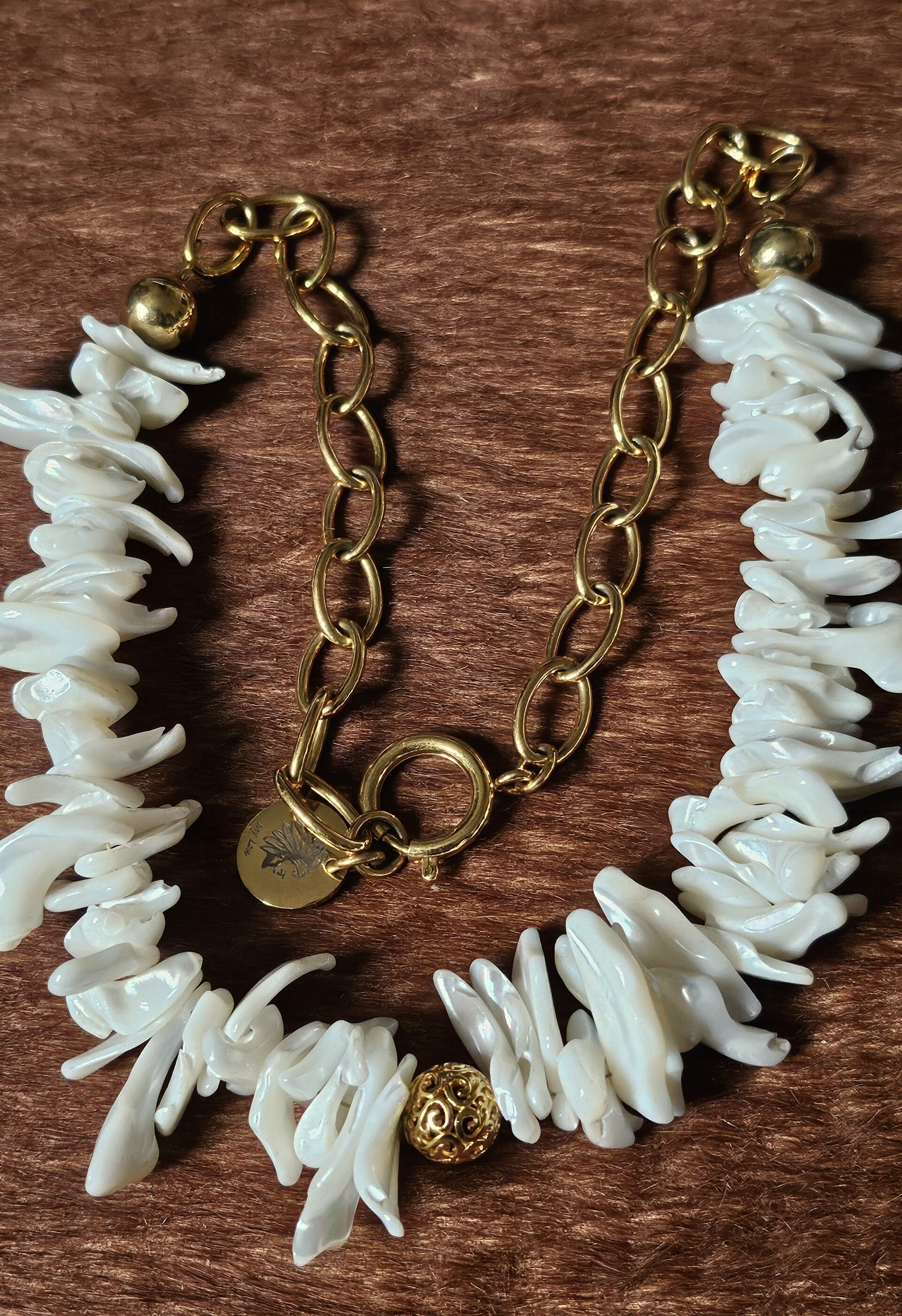 Découvrez l'élégance naturelle de notre collier artisanal, mettant en vedette une coquille du Pacifique montée sur une maille ovale en laiton doré or 24 carats.