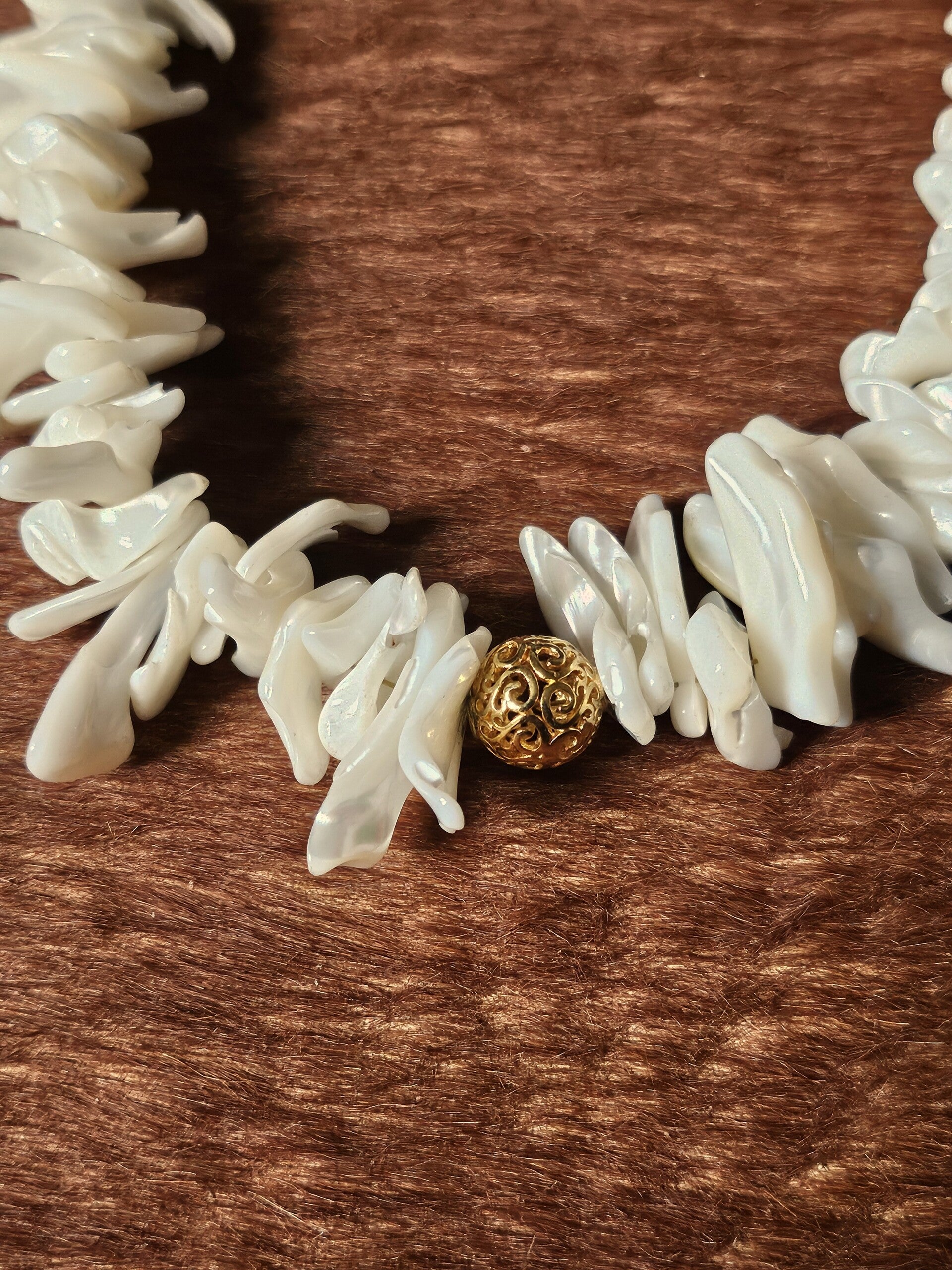 Ce collier ajustable est également orné de perles de 14 mm en plaqué or filigrane, créant une combinaison raffinée de matériaux luxueux et de savoir-faire artisanal.