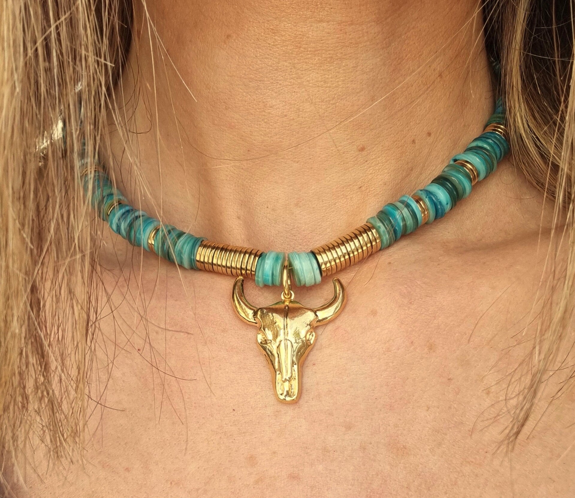 Explorez l'élégance naturelle et la symbolique de notre collier unique, où la beauté des coquillages violets rencontre la puissance emblématique de la tête de buffle.