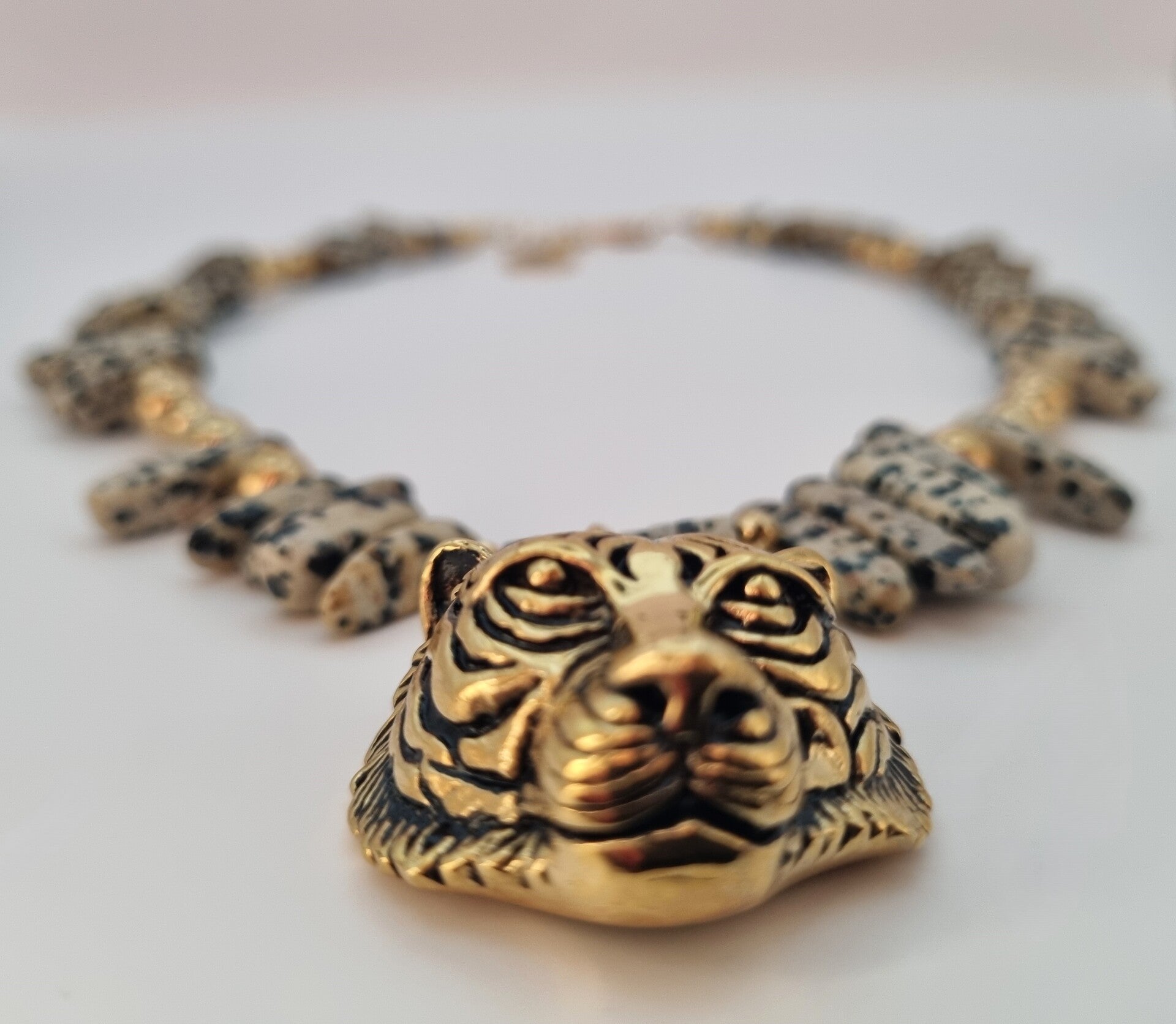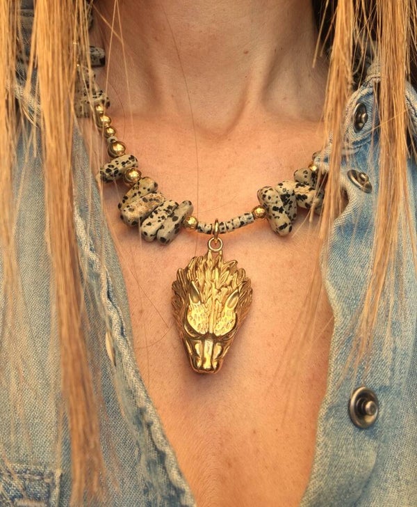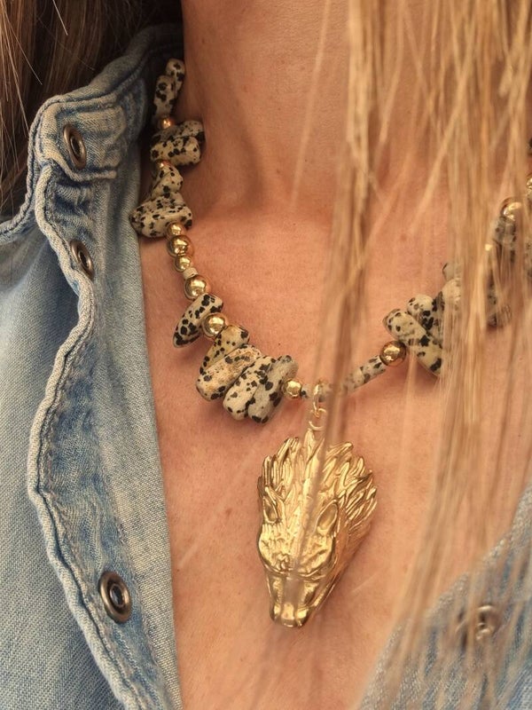 Ce collier unique associe la beauté naturelle du jaspe dalmatien – une pierre aux motifs irrésistiblement graphiques – à l’allure majestueuse d’un pendentif tête de tigre ou de loup en métal doré.
