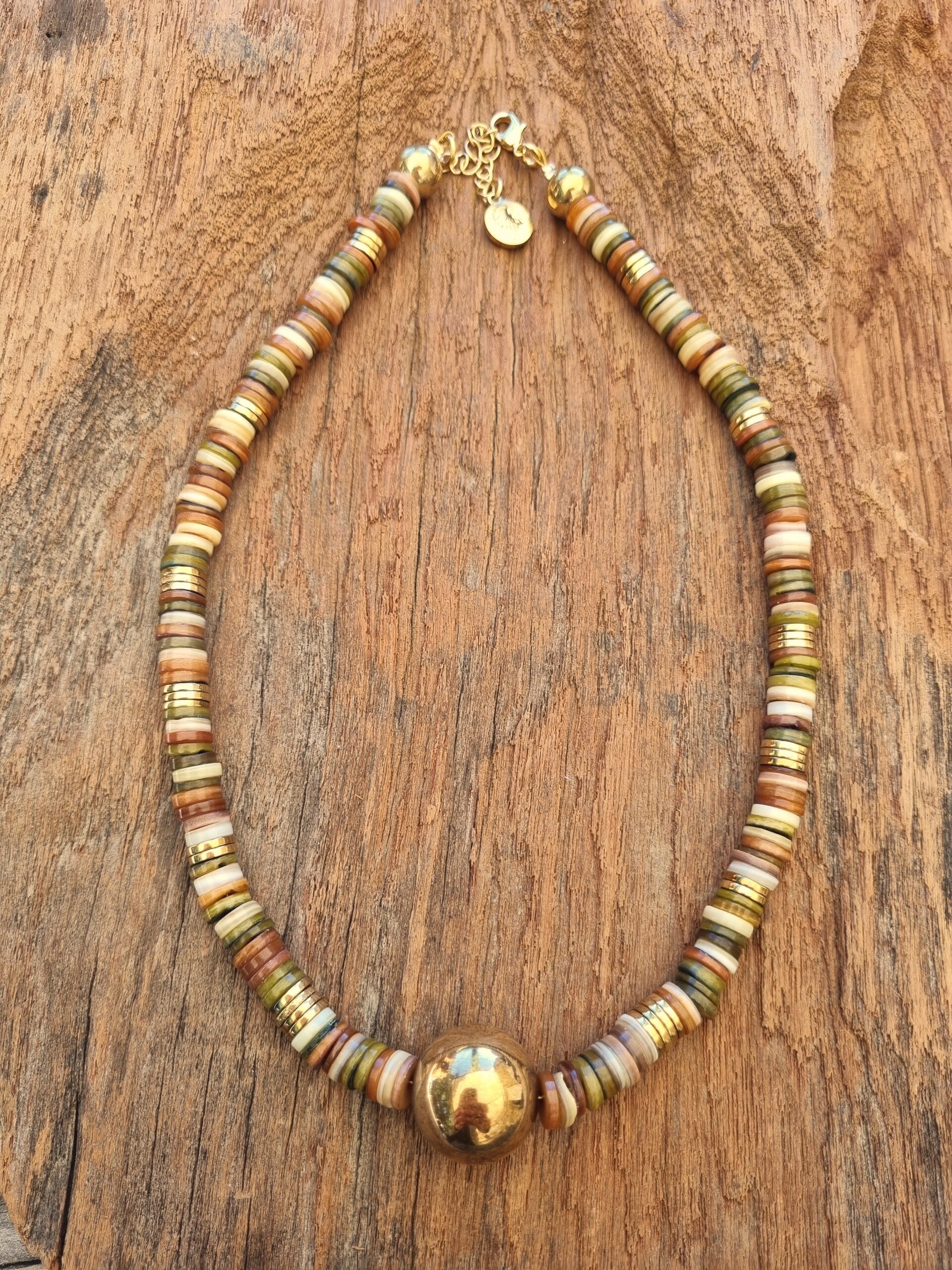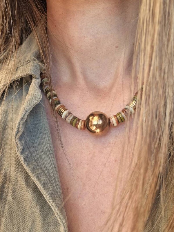 Laissez-vous envoûter par notre collier exclusif, fusion parfaite entre la beauté sauvage des perles de coquillage du Pacifique et la brillance raffinée de l’hématite dorée. Chaque pièce est une ode à la nature, façonnée avec soin pour apporter une touche unique et lumineuse à votre style.