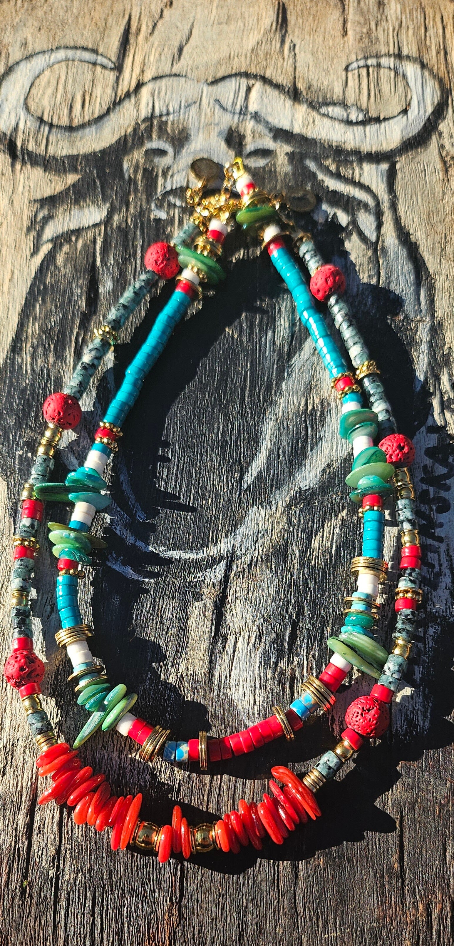 Une création pleine de caractère alliant couleurs vibrantes et matériaux de qualité. Ce bijou se compose de perles heishi vertes, rouges et blanches, sublimées par des coquillages du Pacifique et des intercalaires en acier inoxydable. Le fermoir et la rallonge en laiton doré or 24 carats apportent une touche sophistiquée à ce bijou unique.