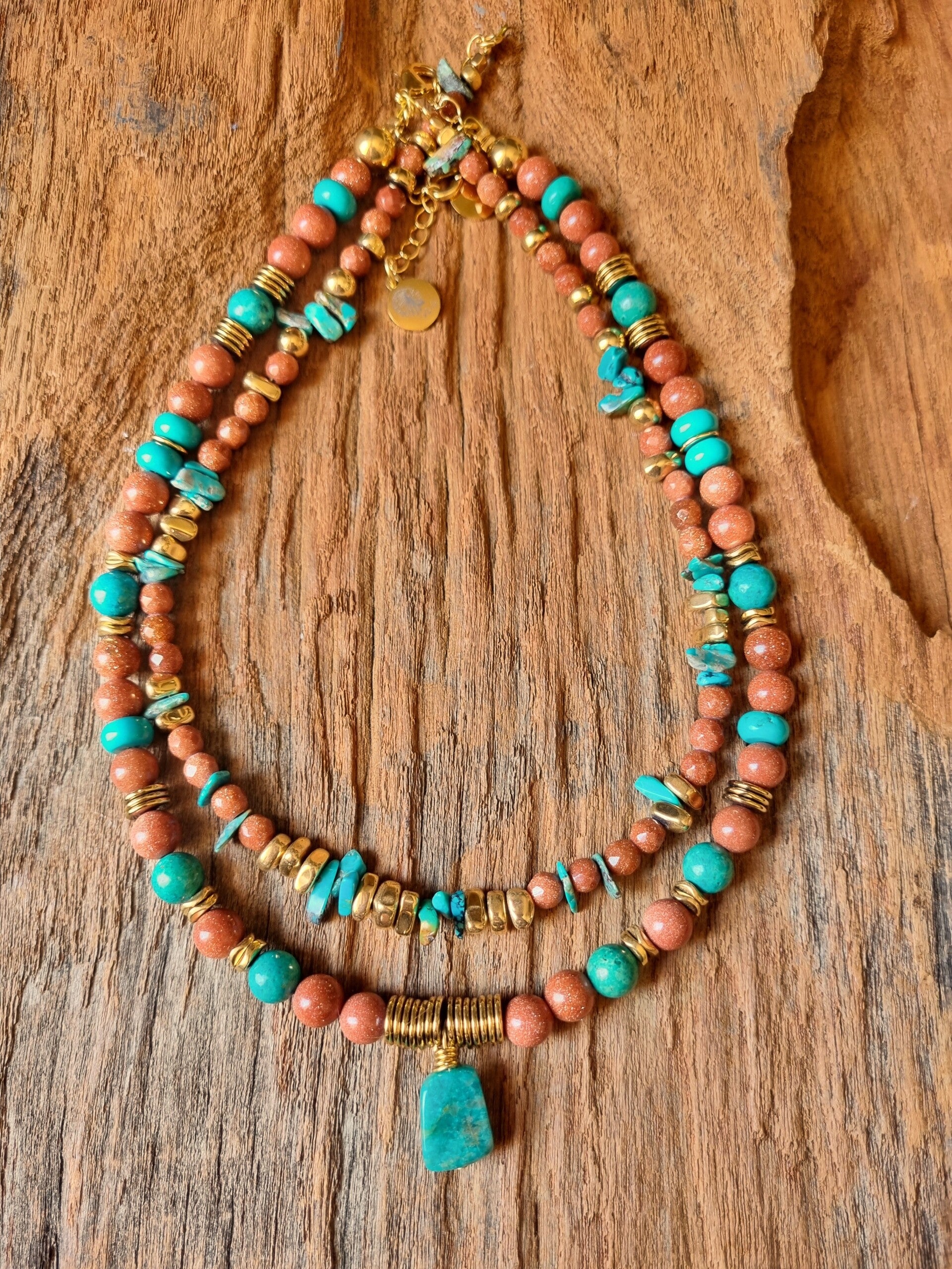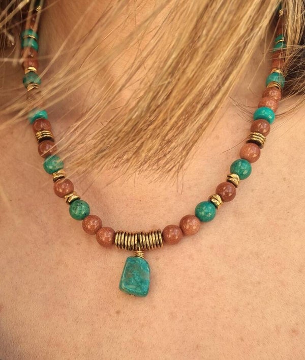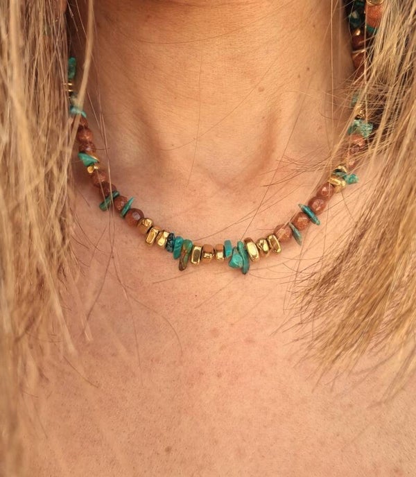 Un bijou délicat mêlant perles rondes sand pailletées, amazonite, hématite et touches de turquoise de Chine. Idéal pour illuminer votre tenue avec des nuances douces et lumineuses.