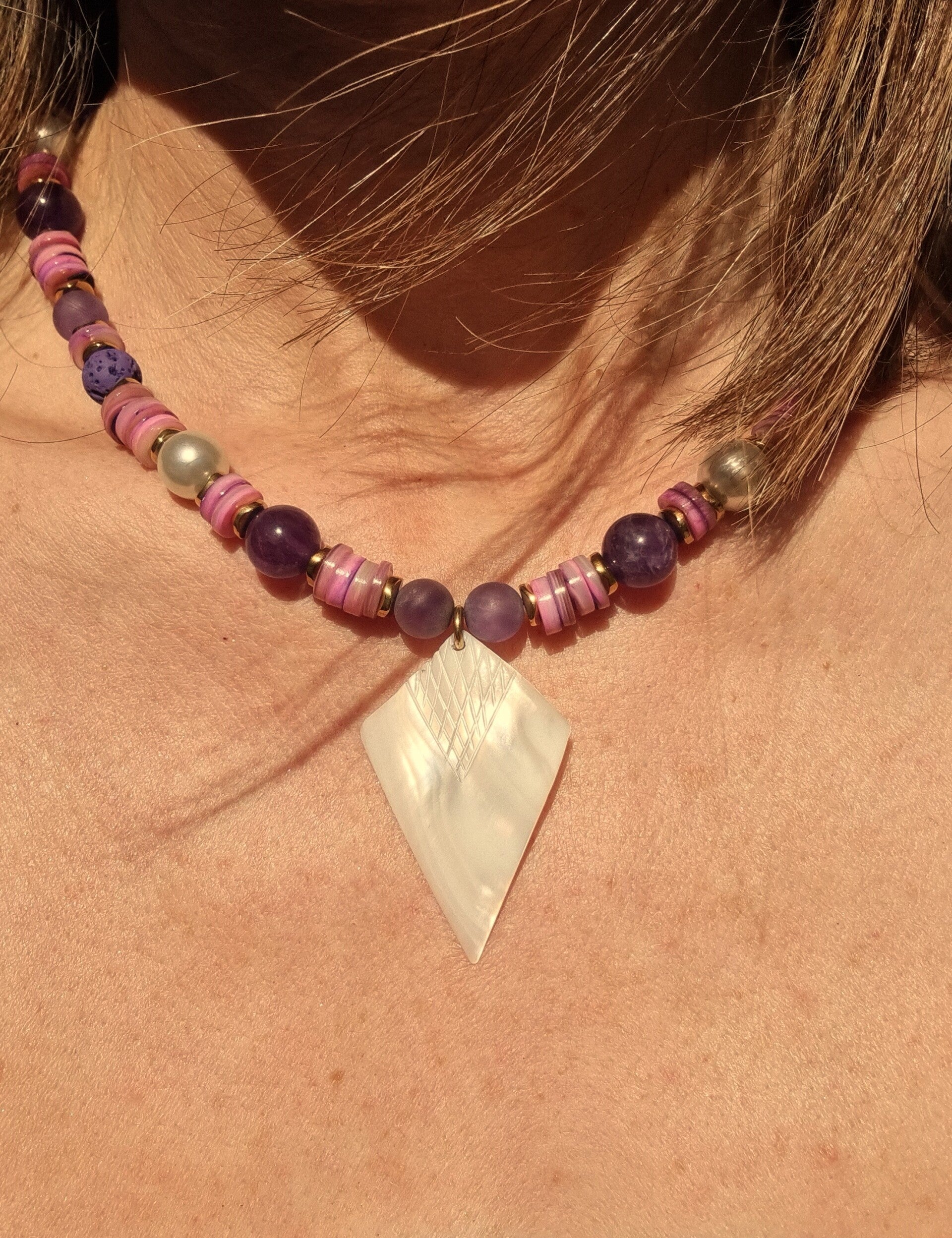 Ce bijou raffiné est composé d'un pendentif en nacre, hématite, perles de lave, coquillage du Pacifique, ainsi que des améthystes mat et brillantes du Brésil. Chaque élément a été soigneusement sélectionné pour créer un contraste subtil entre la douceur de la nacre et l'intensité des pierres naturelles. Un véritable symbole de sophistication et de connexion avec la nature.