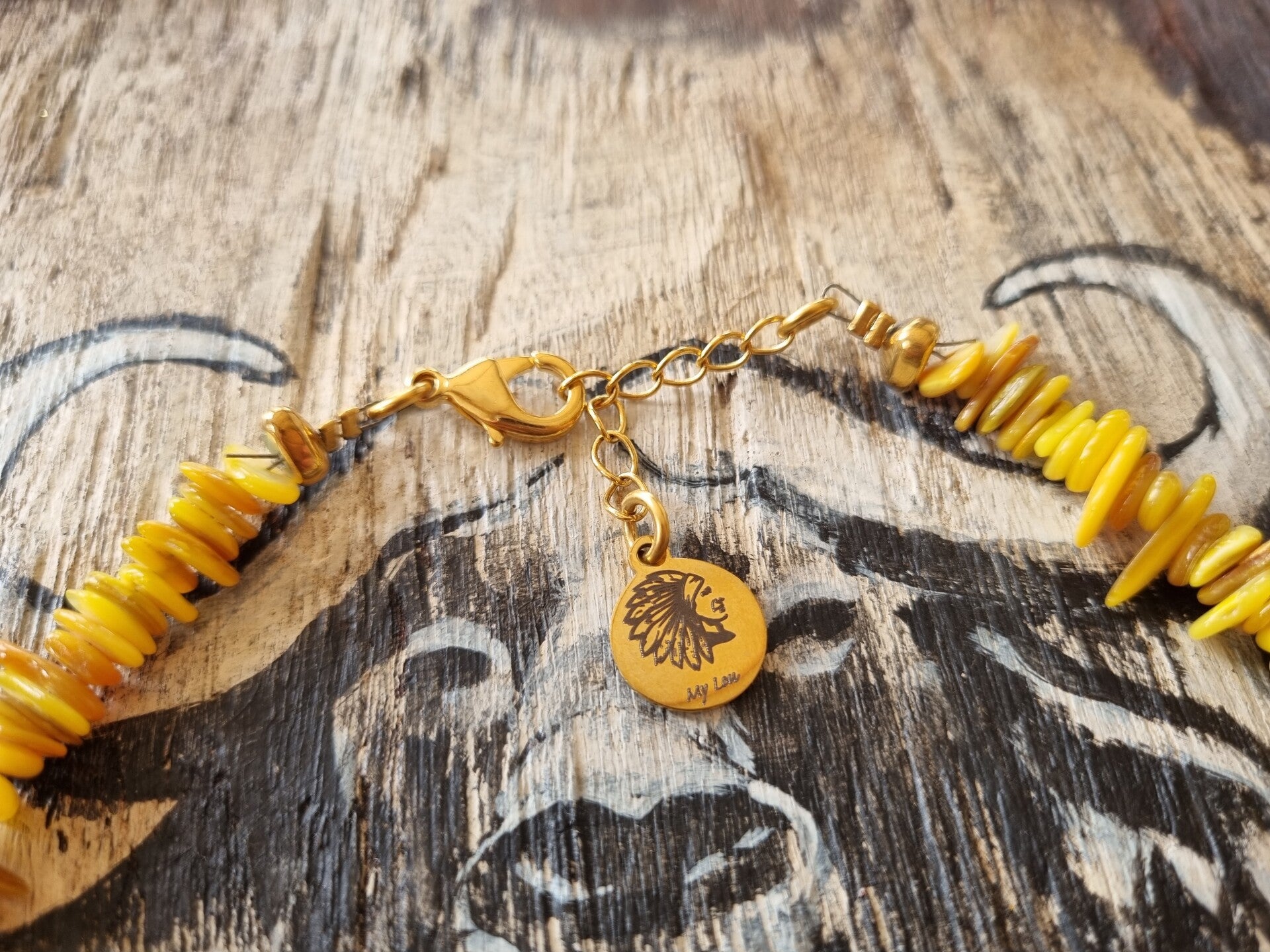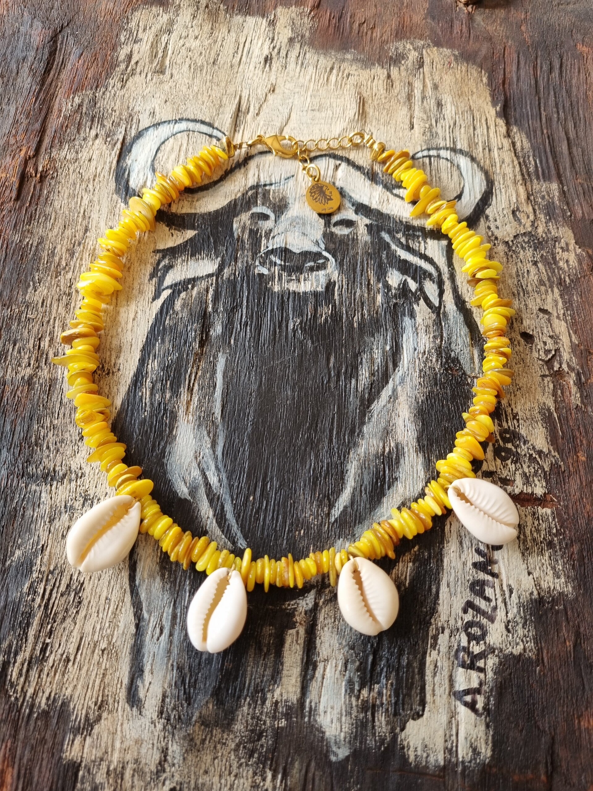Les finitions en laiton doré à l’or fin 24 carats apportent une touche précieuse, faisant de ce collier un accessoire idéal pour illuminer vos tenues, qu’elles soient estivales ou plus sophistiquées.