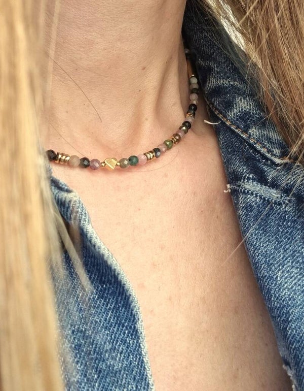 Un collier raffiné où les perles facettées de tourmaline révèlent des nuances subtiles et éclatantes, apportant une touche de couleur et d’élégance. Les pierres d’hématite ajoutent une profondeur scintillante et un équilibre harmonieux, sublimant cette création intemporelle.