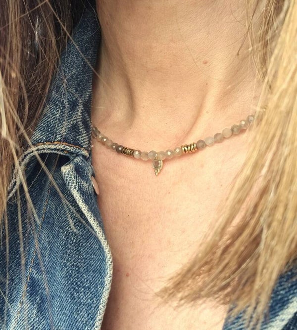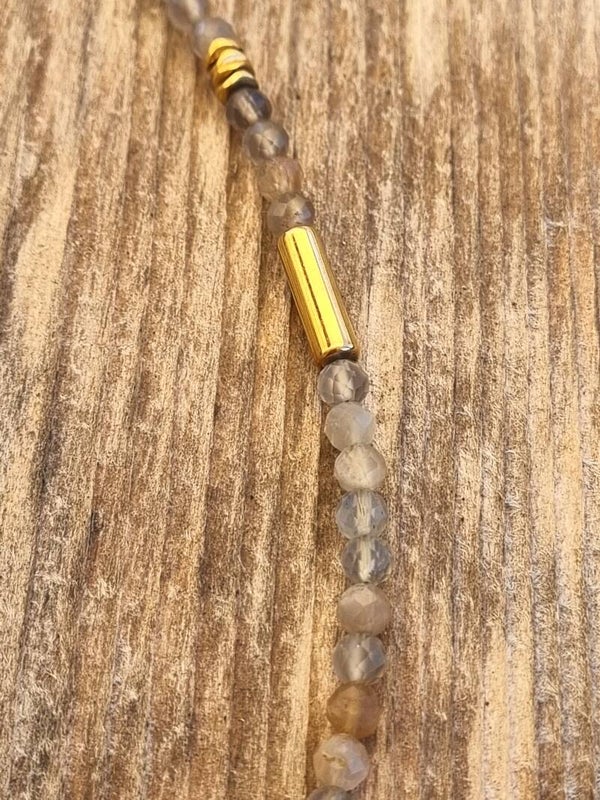 Les perles facettées de sunstone, aux teintes chaudes et lumineuses, illuminent ce collier, tandis que les pierres d'hématite apportent une touche scintillante. En son centre, un pendentif en labradorite, aux reflets envoûtants, diffuse une énergie protectrice et intuitive. Le tout est sublimé par un pendentif doré en or fin 24 carats, ajoutant une finition luxueuse et élégante.