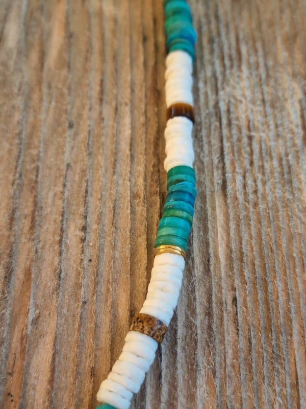 Perles heishi turquoise et blanches, rappelant les nuances des paysages naturels