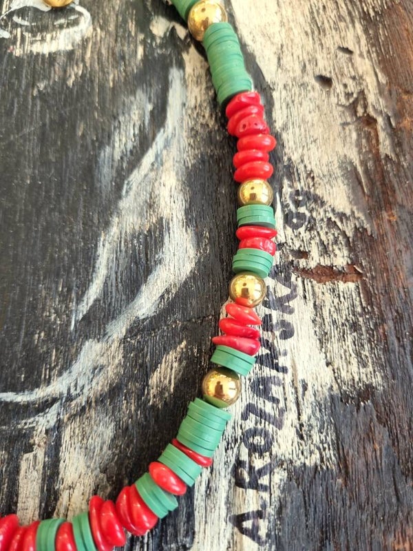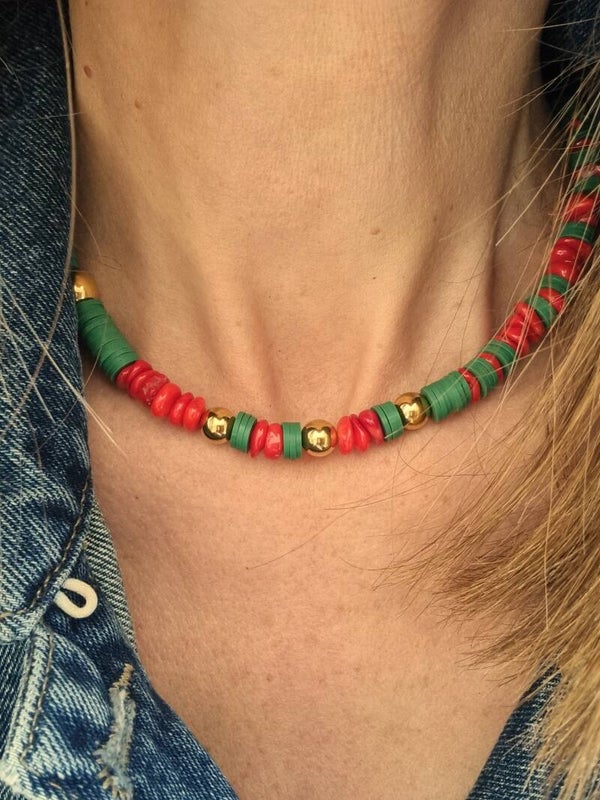 Création audacieuse et pleine de caractère, le collier ROXANE associe la texture ludique des perles heishi en polymère aux nuances intenses des perles de corail et à l'éclat délicat de l’hématite. Ce bijou original et coloré incarne l’équilibre parfait entre modernité et élégance, apportant une touche vibrante et raffinée à toutes vos tenues.