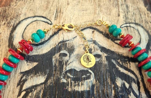 Le pendentif en forme de plume, doré à l’or 24 carats (3 microns), est l’élément central du collier, symbolisant la légèreté et la liberté. Associé aux matériaux naturels comme la magnésite turquoise et le corail, il reflète l’authenticité et la puissance de l’artisanat inspiré des traditions amérindiennes.