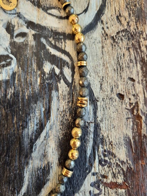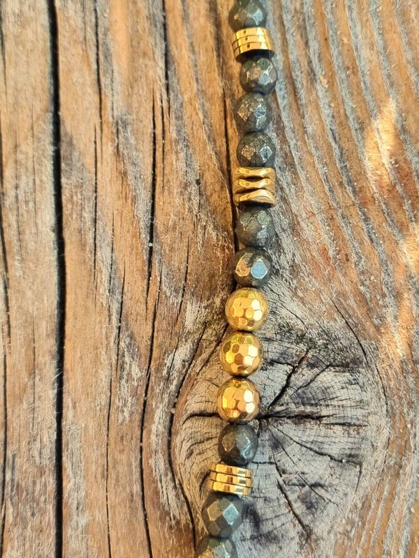 Ce bijou met en valeur des pierres naturelles de pyrite facettée et d’hématite. Chaque détail a été soigneusement conçu pour créer une harmonie parfaite entre éclat et raffinement.
