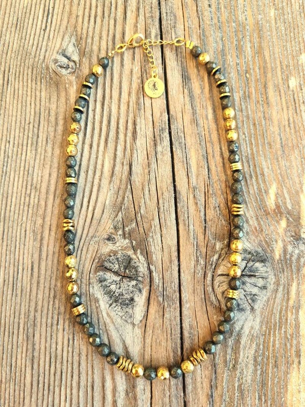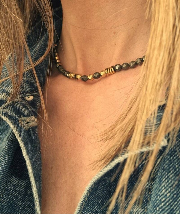 #collierflore#bijouxmylou#bijouxartisanal#pyrite#hematite#or24carats#bijouxfemme#bijouxtendance#styleboheme#bijouunique#bijouauthentique#madeinfrance#bijouxcreateur#bijouxluxe#femme
