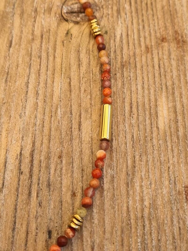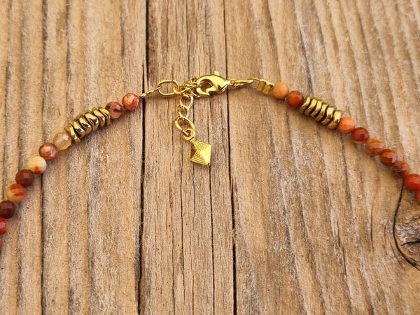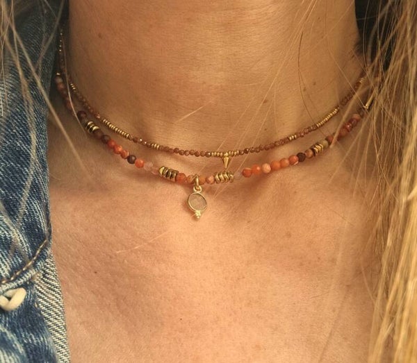 Avec ses perles facettées d'Agathe ocre et ses hématites scintillantes, ce collier est une ode aux teintes chaleureuses et naturelles. Le fermoir et la chaînette en laiton doré à l’or 24 carats assurent un ajustement confortable et une finition luxueuse.