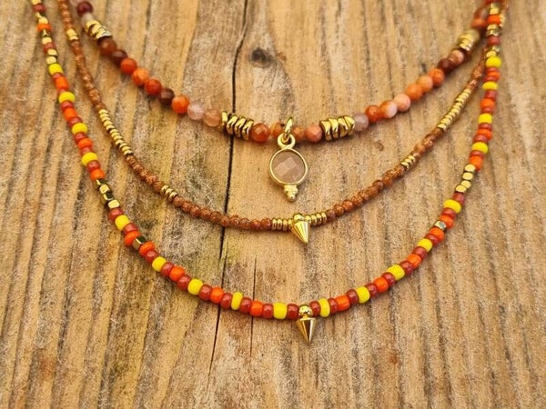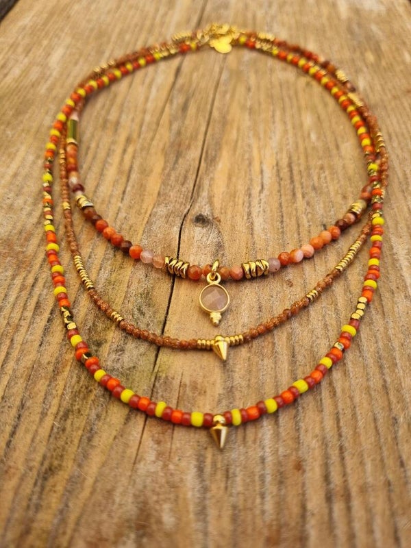 - Perles facettées (Saand ou Agathe Ocre) ou perles de rocaille (Ocre, Orange et Jaune)