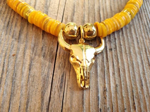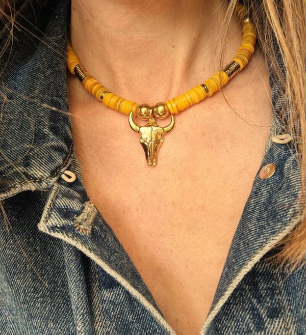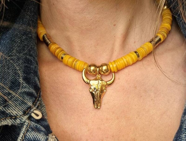 Découvrez l'éclat solaire et la symbolique intemporelle de notre collier unique, où la douceur des coquillages jaunes s’associe à la puissance emblématique de la tête de buffle. Ce bijou lumineux incarne l’esprit de l’Amérique du Nord, revisité avec une touche contemporaine.