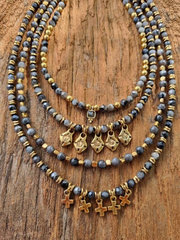 Croix dorées en laiton, perles en Labradorite, hématites, finition plaqué or 24 carats