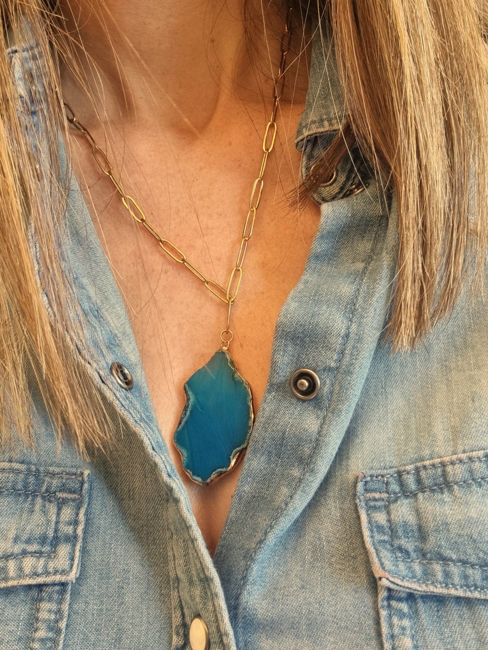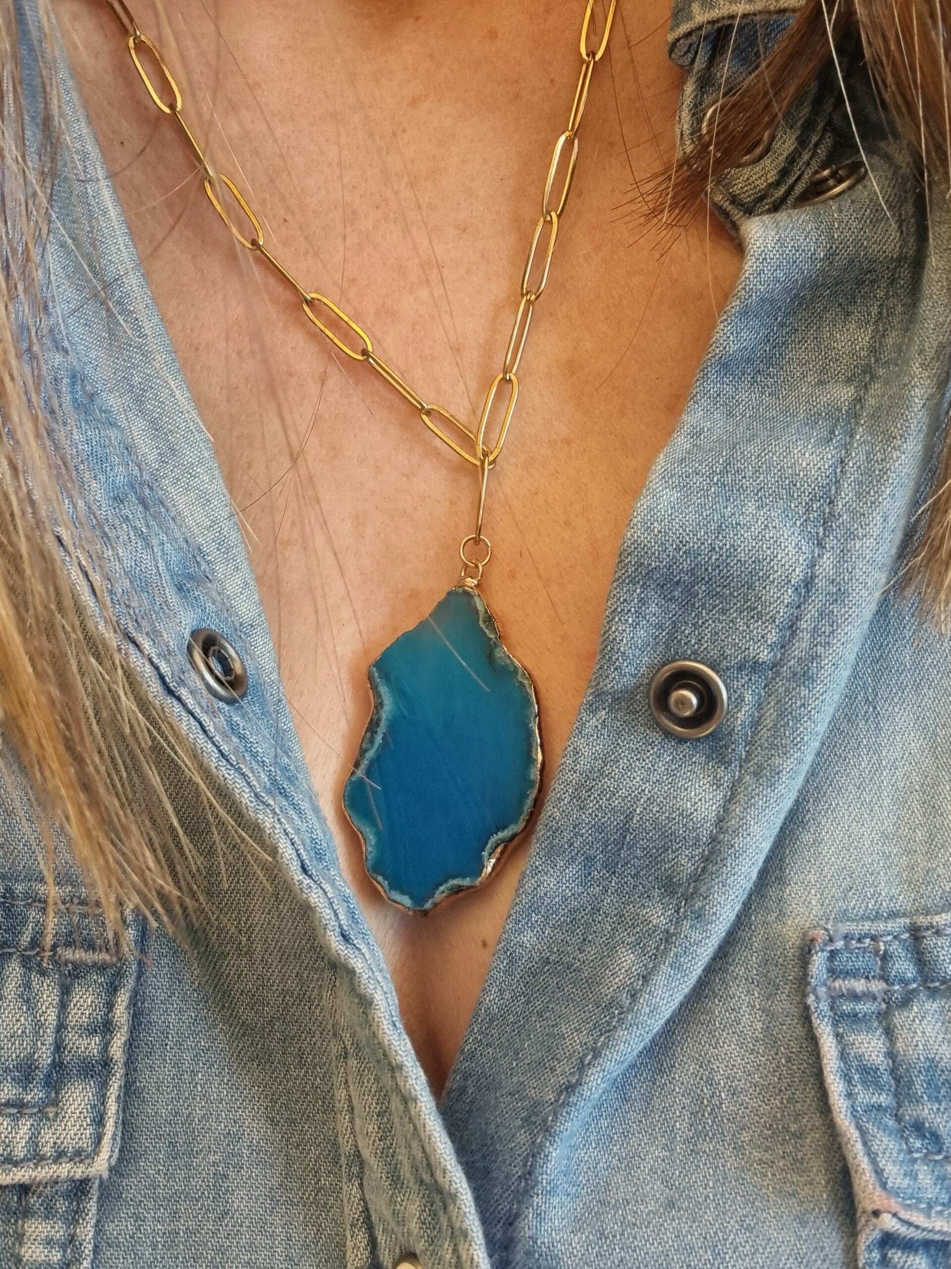 Pendentif en agate africaine bleue, symbole de profondeur et d’équilibre