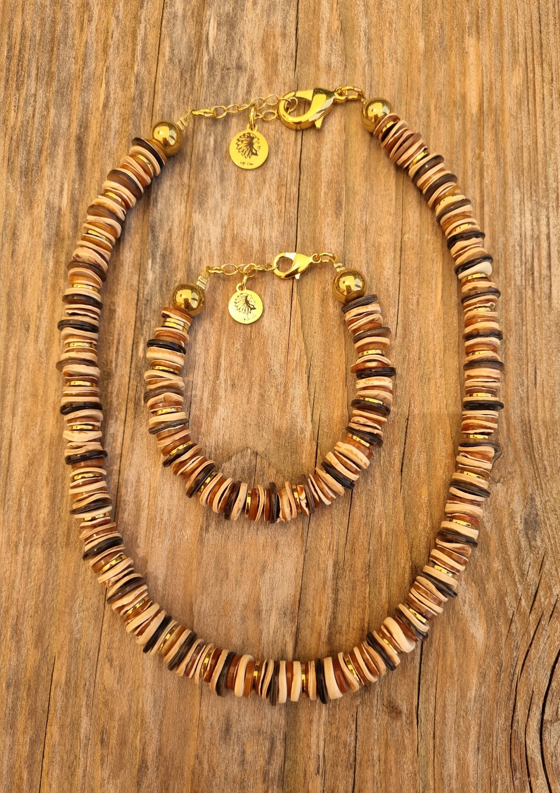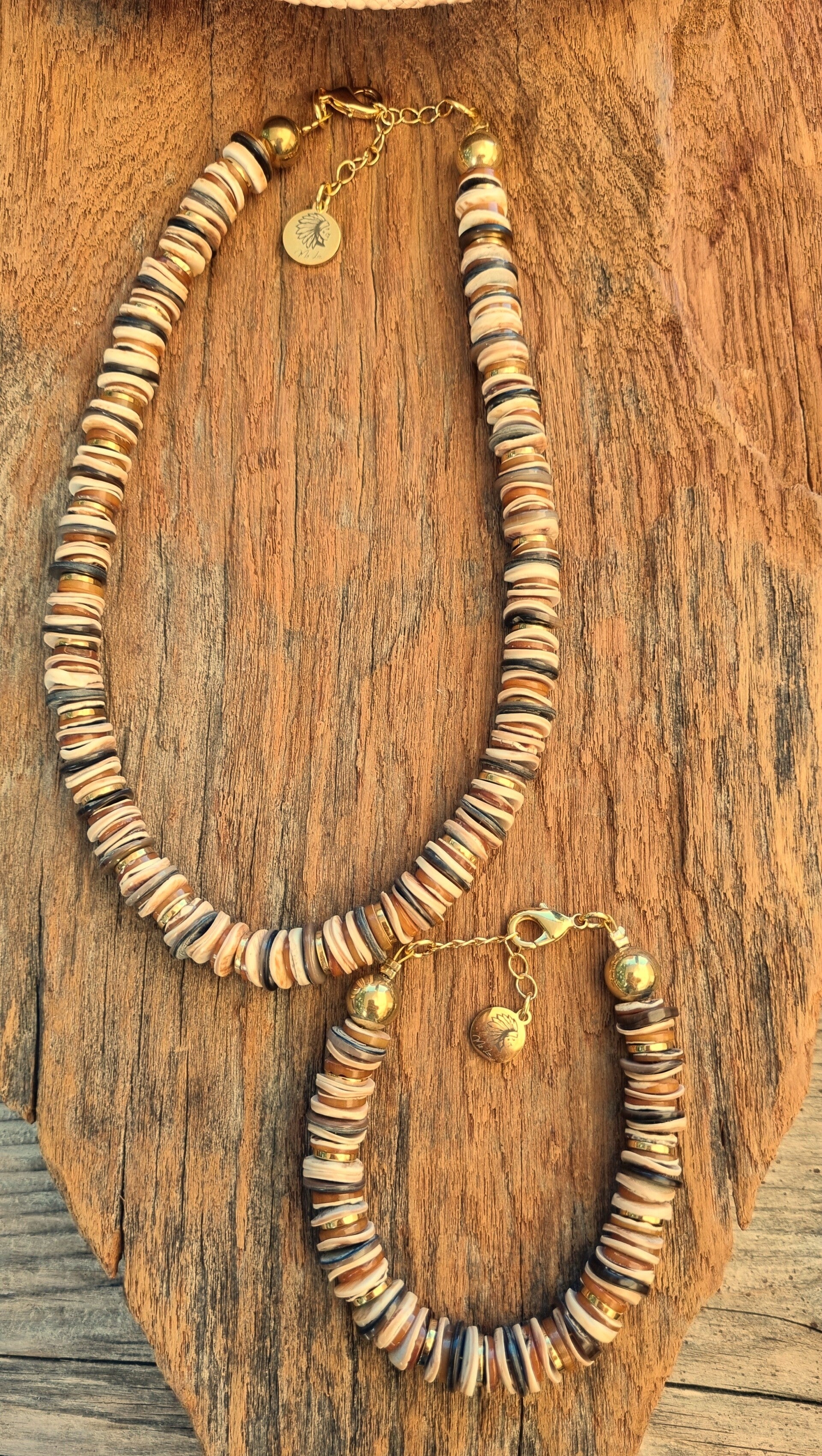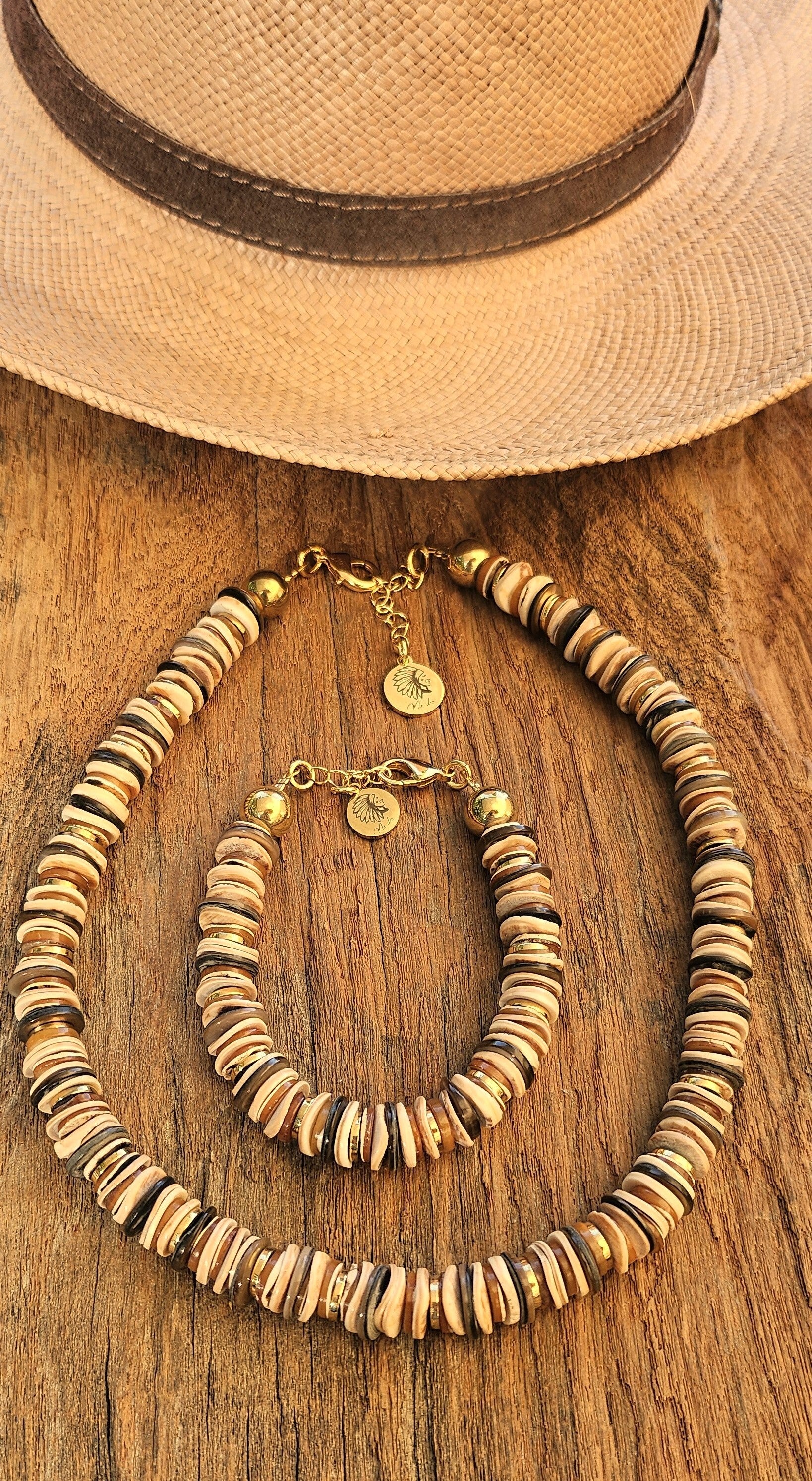 Explorez la beauté naturelle et chaleureuse de cette parure bohème composée d’un collier et d’un bracelet, aux nuances douces de sable, beige, caramel et brun profond. Réalisée à partir d’un subtil mélange de perles de coquillage naturelles, cette création évoque l’élégance brute des matières authentiques, inspirée par la terre et la nature.