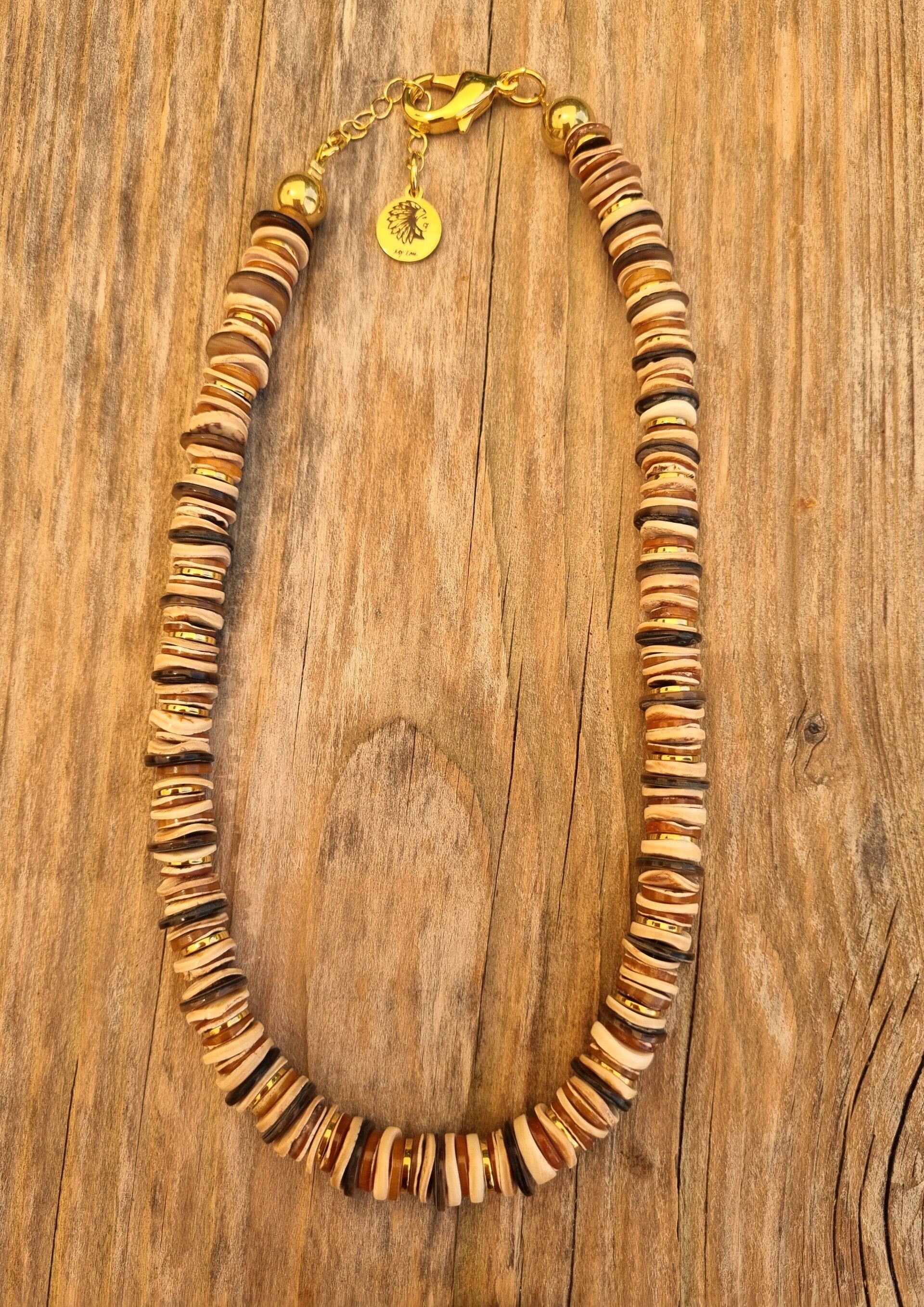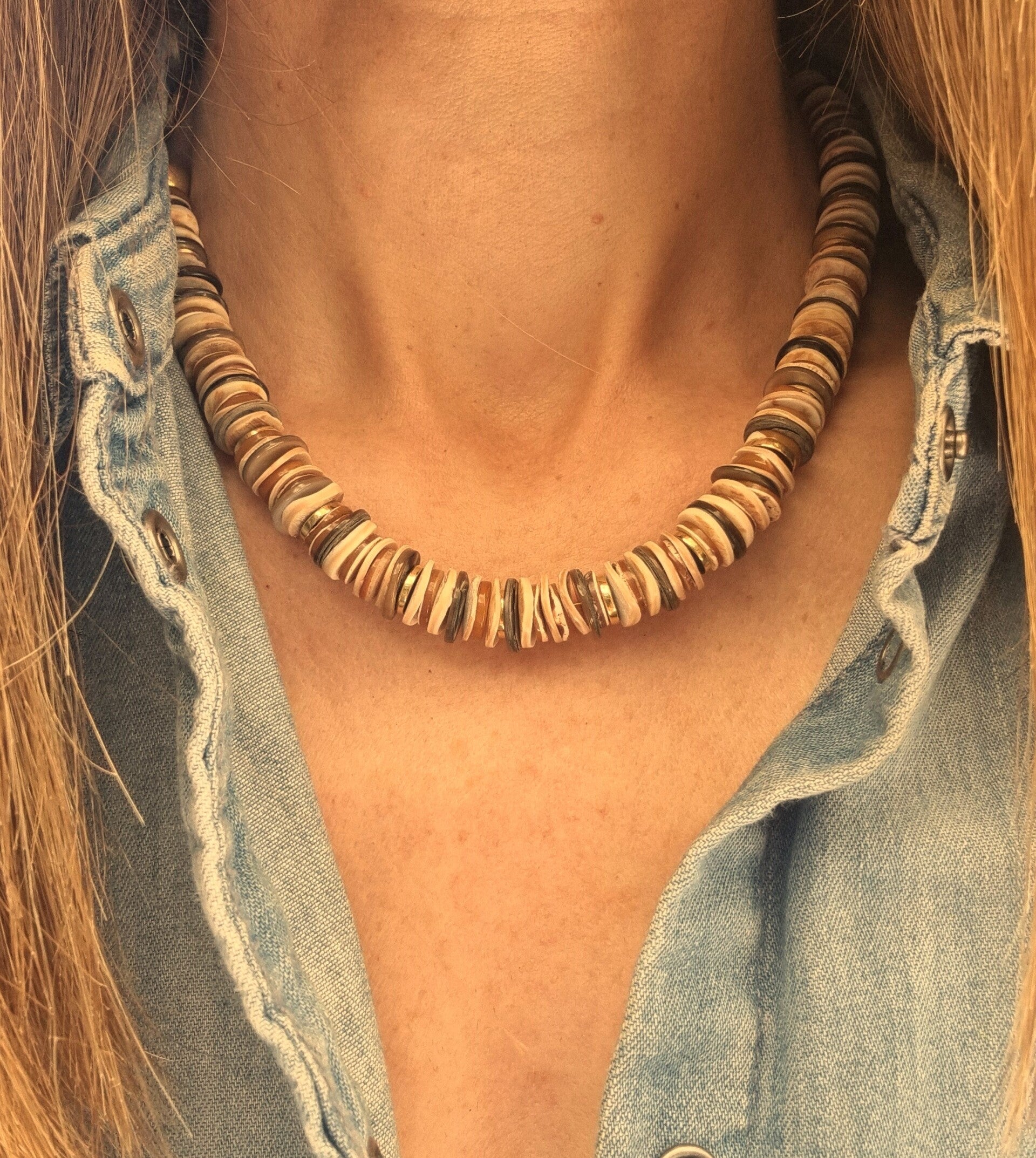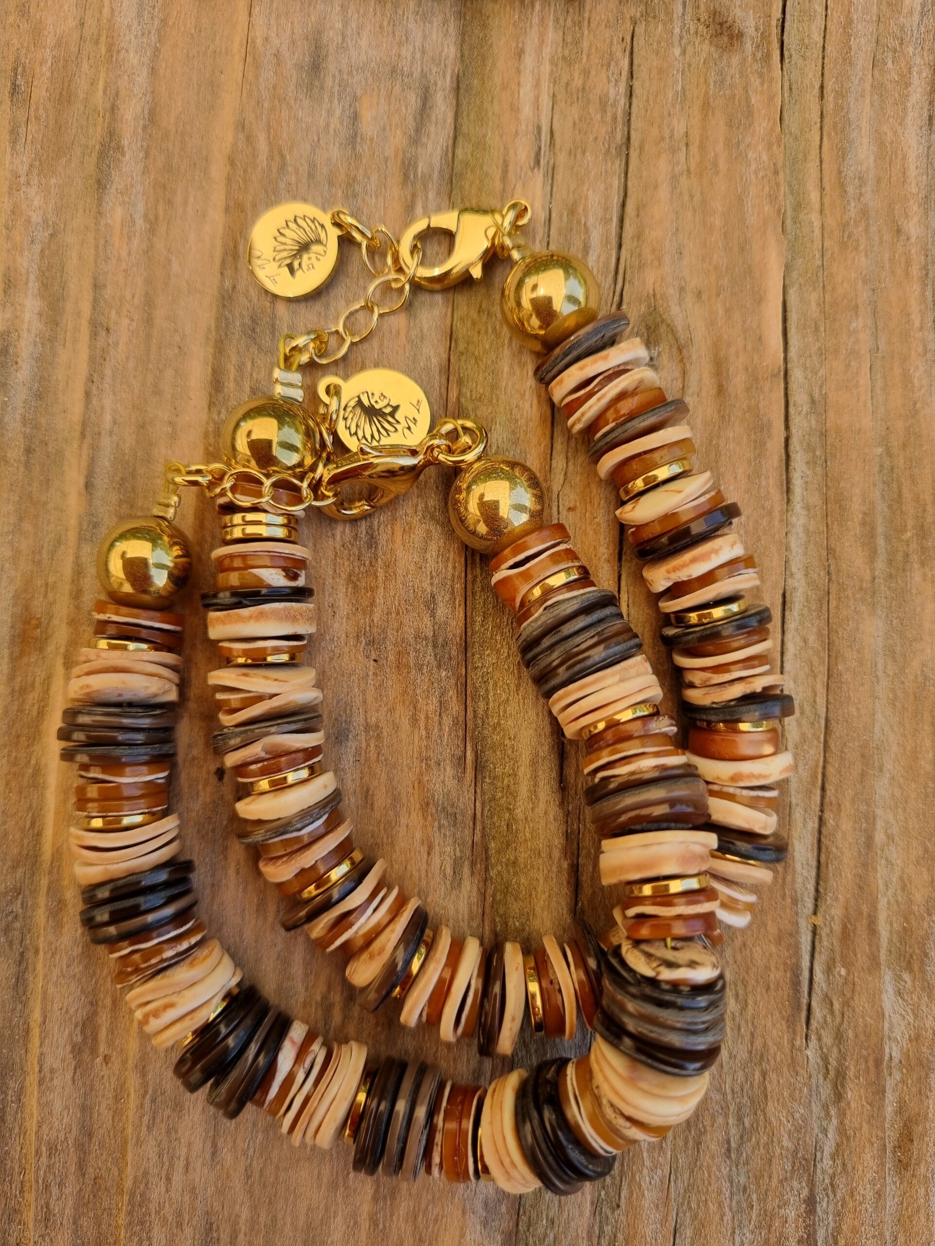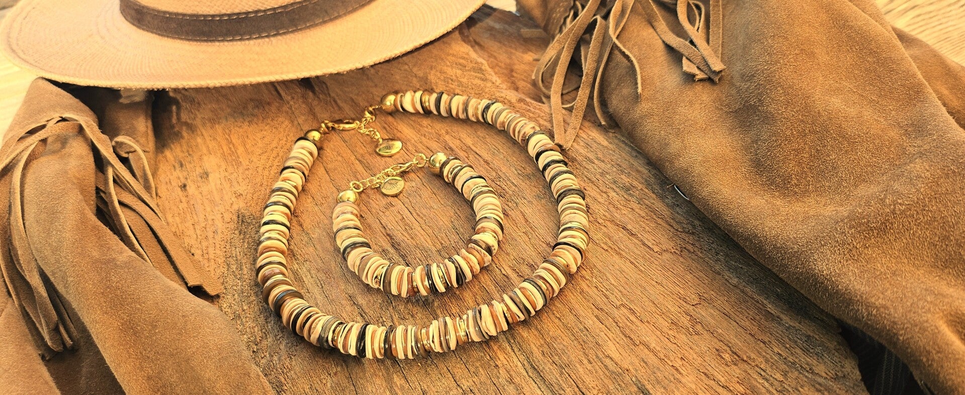 Explorez la beauté naturelle et chaleureuse de cette parure bohème composée d’un collier et d’un bracelet, aux nuances douces de sable, beige, caramel et brun profond. Réalisée à partir d’un subtil mélange de perles de coquillage naturelles, cette création évoque l’élégance brute des matières authentiques, inspirée par la terre et la nature.