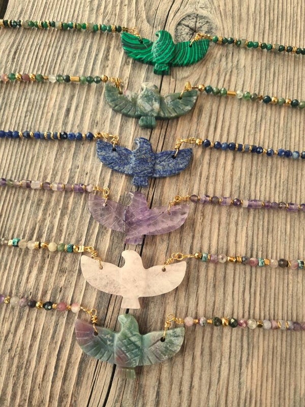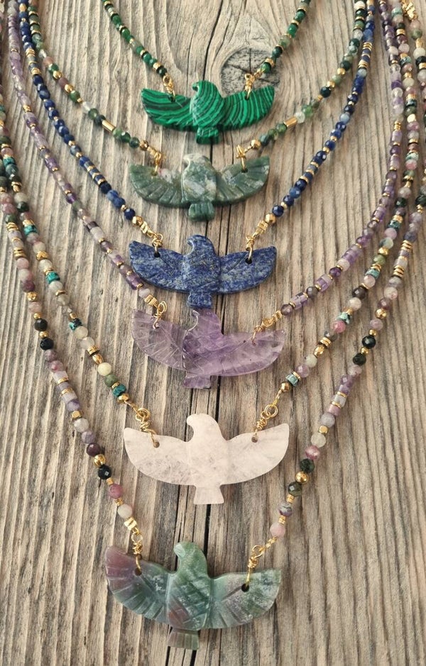 Explorez la beauté vibrante et symbolique de ce collier orné d’un phénix sculpté dans une pierre naturelle, symbole de renaissance, de force intérieure et de transformation.