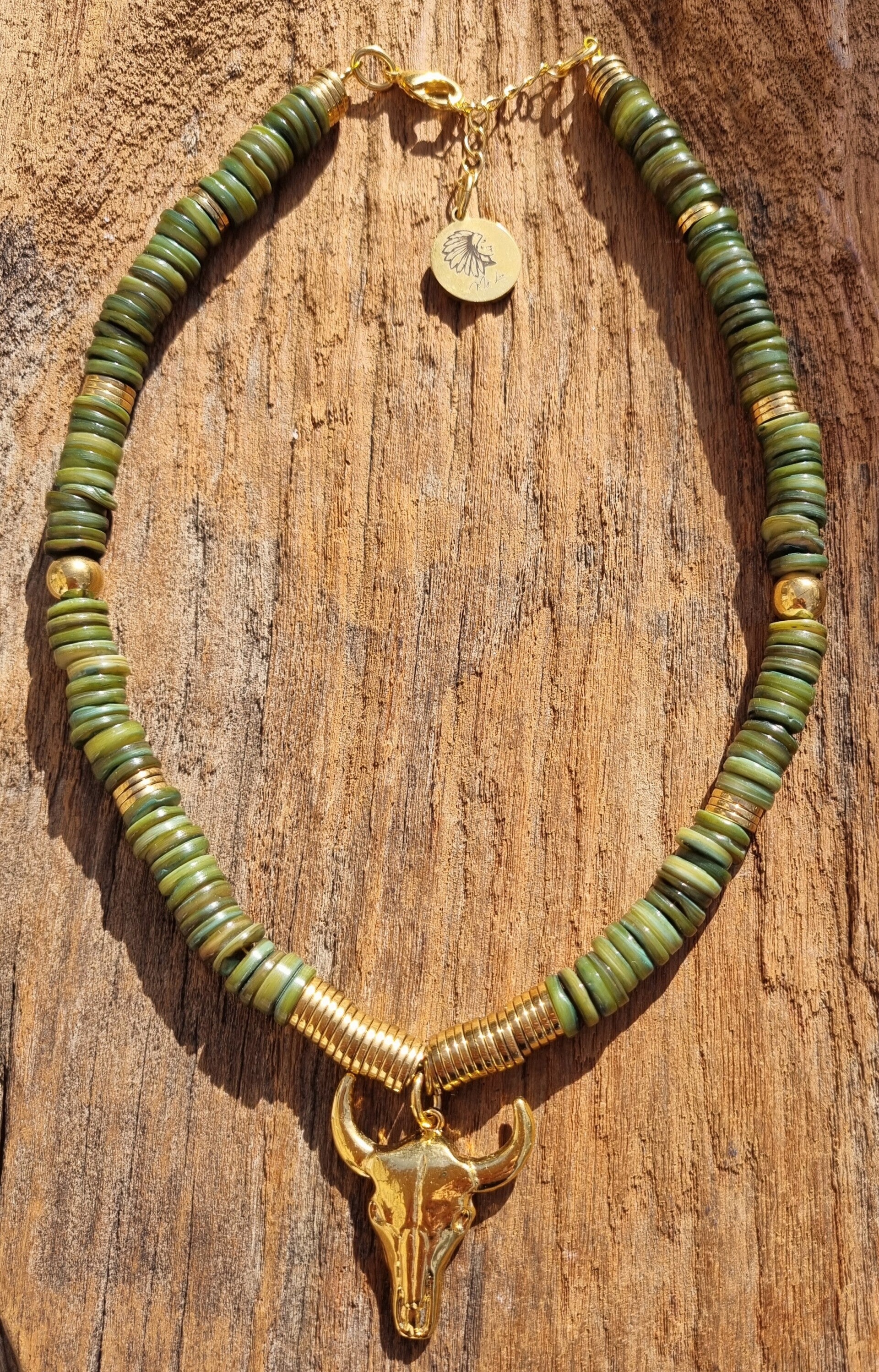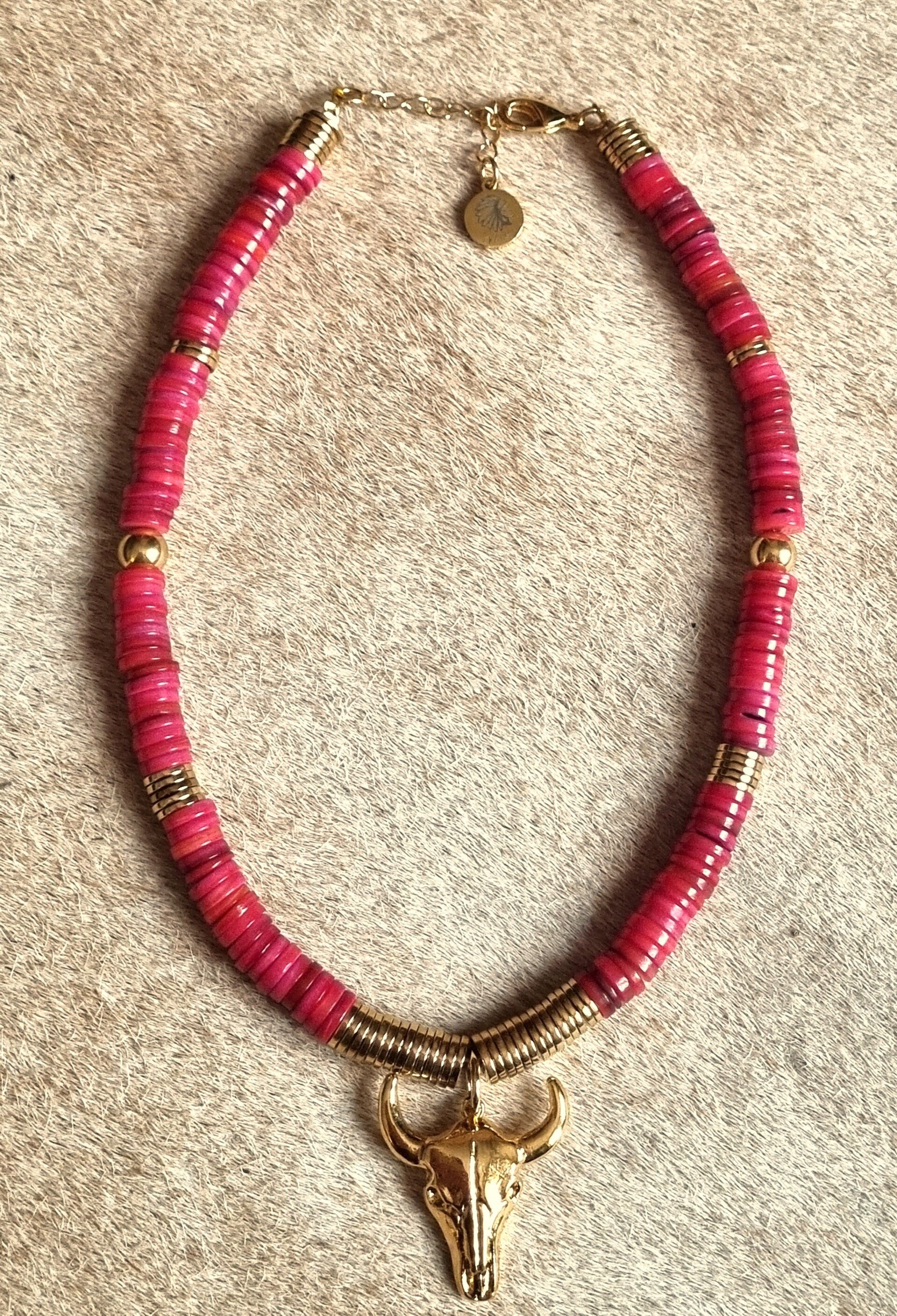 Explorez l’élégance solaire et la symbolique de notre collier TESS, où la chaleur des perles de coquillage fushia rencontre la puissance emblématique de la tête de buffle dorée.