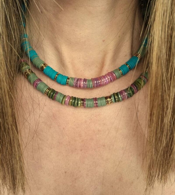 - Perles Heishi en coquillage du Pacifique (teintes kaki, vieux rose violine, bleu canard)