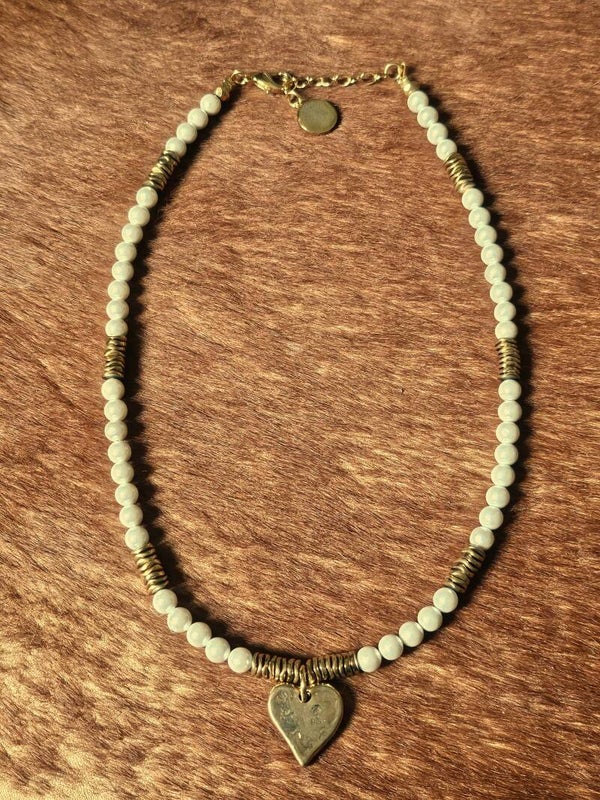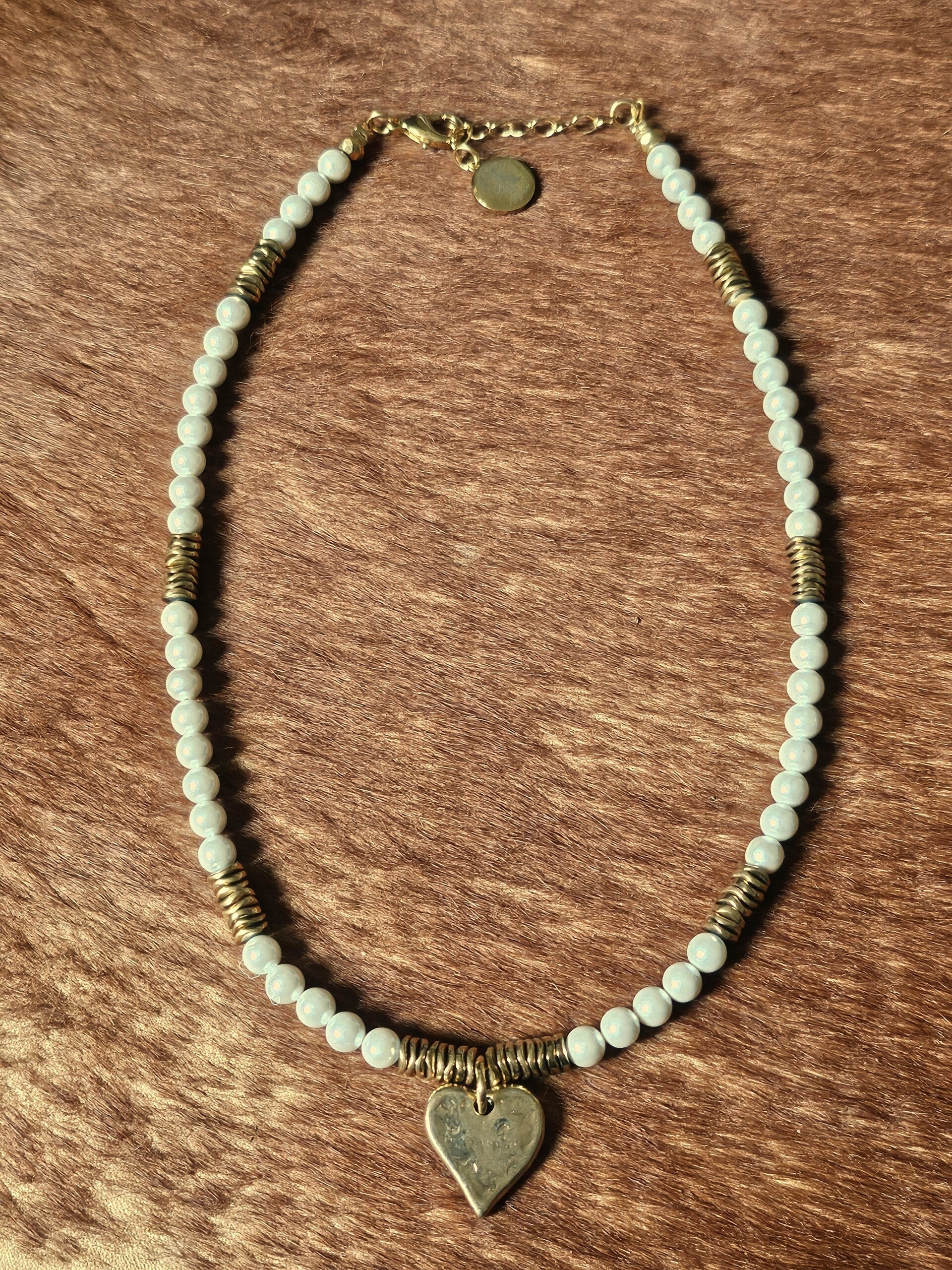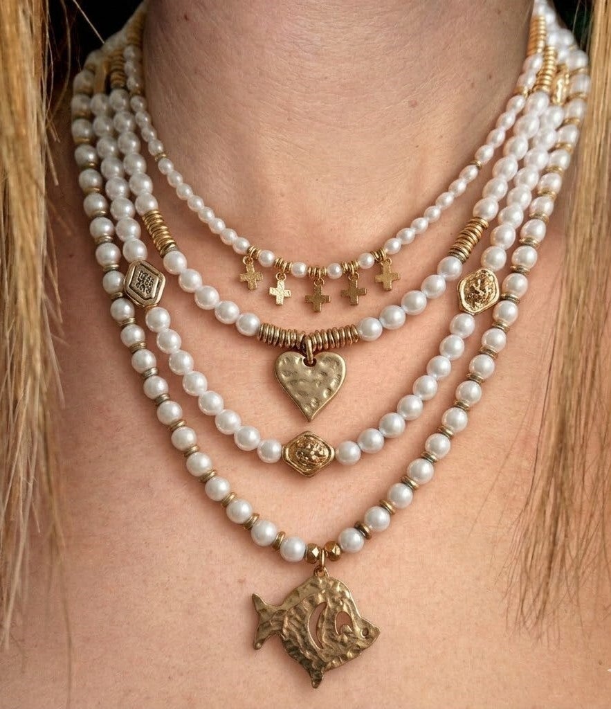 Le troisième collier est orné d’un pendentif cœur doré, symbole d’amour et de douceur. Les perles nacrées et les anneaux dorés créent un équilibre subtil entre élégance et modernité.