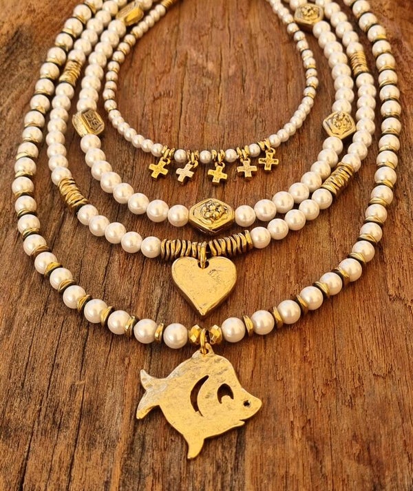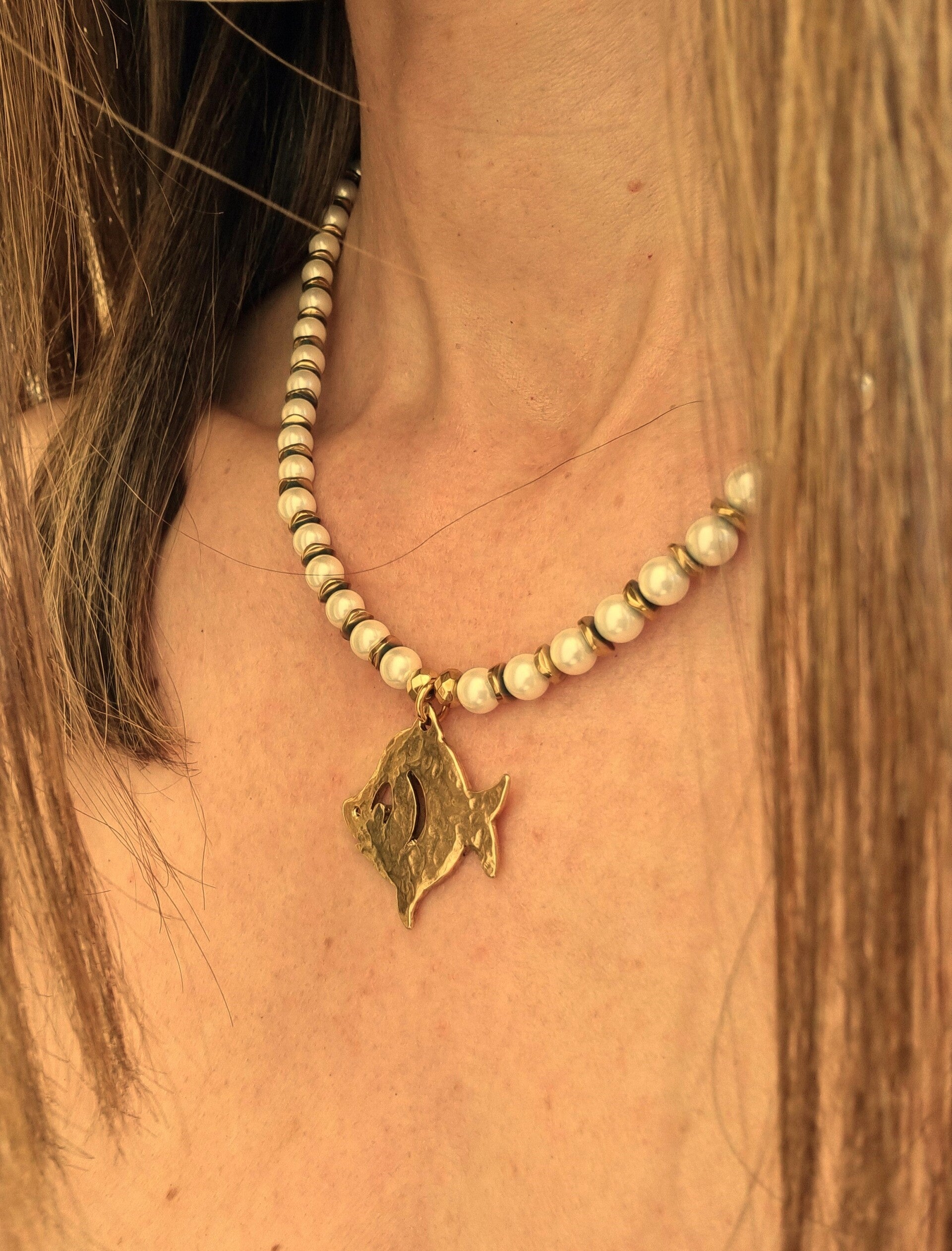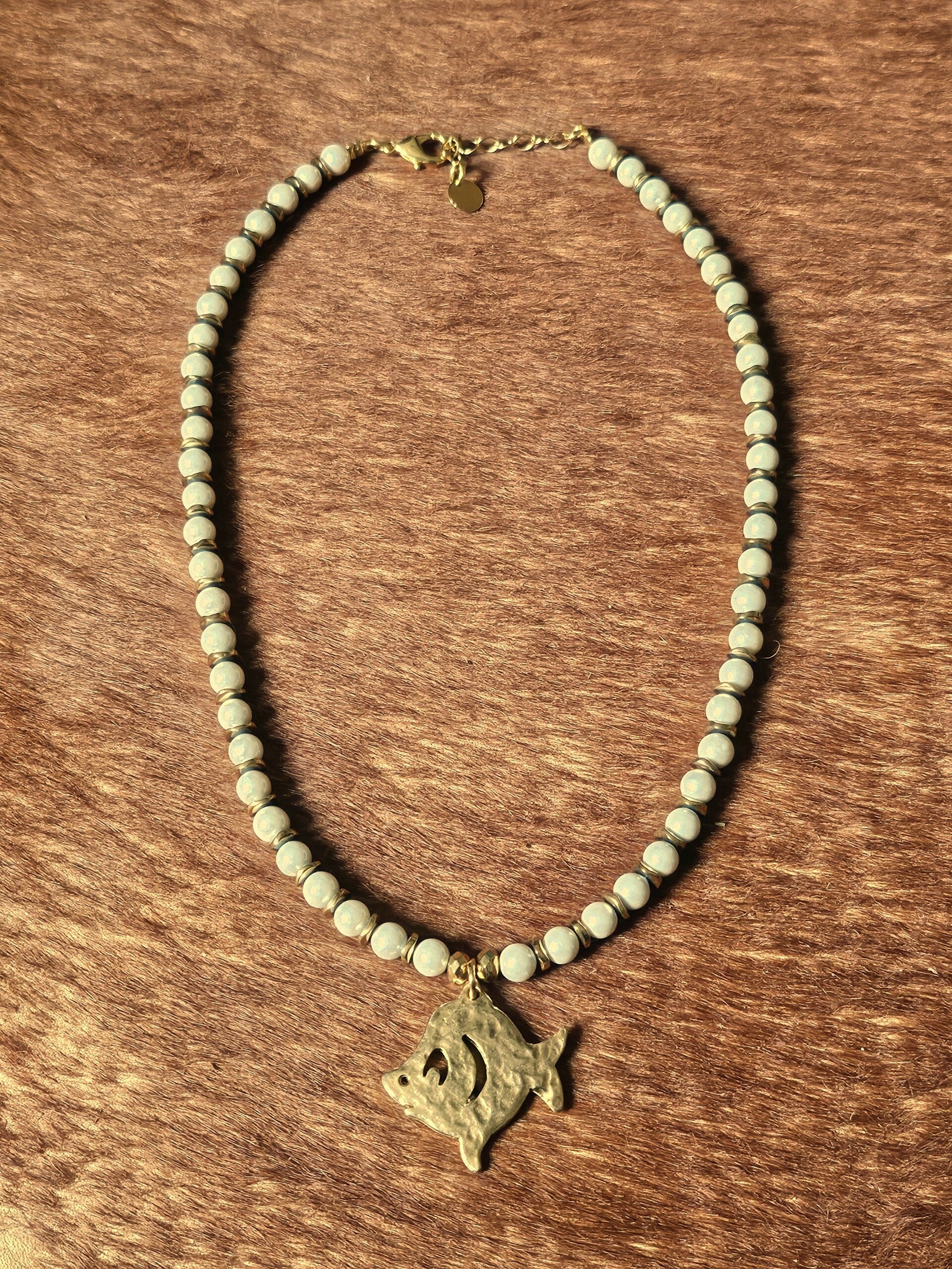 Le dernier collier, le plus long, se distingue par son pendentif poisson doré martelé, inspiré de l’univers marin et des talismans protecteurs. Il apporte une touche bohème et solaire à la composition.