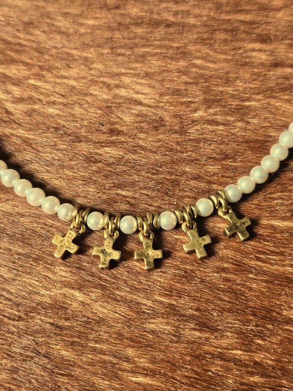 Le premier collier, le plus délicat, est composé de fines perles coquillage du Pacifique nacrées ponctuées de cinq petites croix dorées suspendues. Il apporte une touche symbolique et raffinée qui illumine le décolleté.